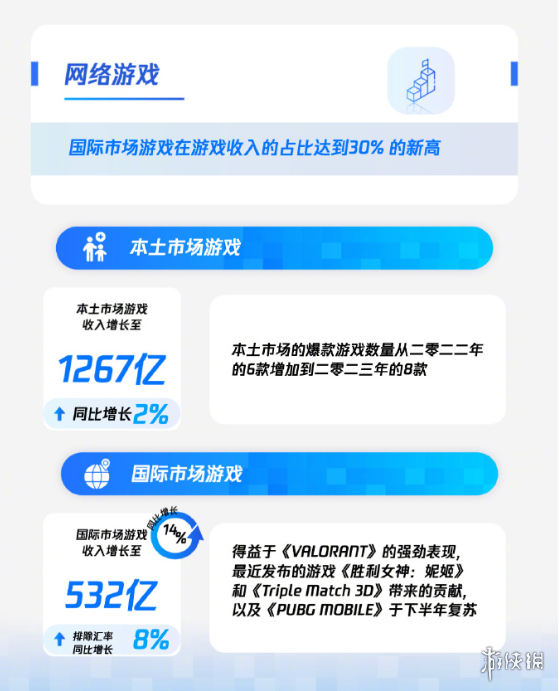 腾讯公布了2023年全年财报,其中网络游戏业务方面,腾讯2023年收入为1799亿元,同比增长5.4%。国际市场成为公司游戏的新增长引擎,2023年国际市场收入在公司游戏总收入占比首次提升至30%。本土游戏方面,2023年公司本土市场季度平均日活跃用户数手游端超过500万,电脑端超过200万,年流水超过40亿元的游戏从6款上升至8款。