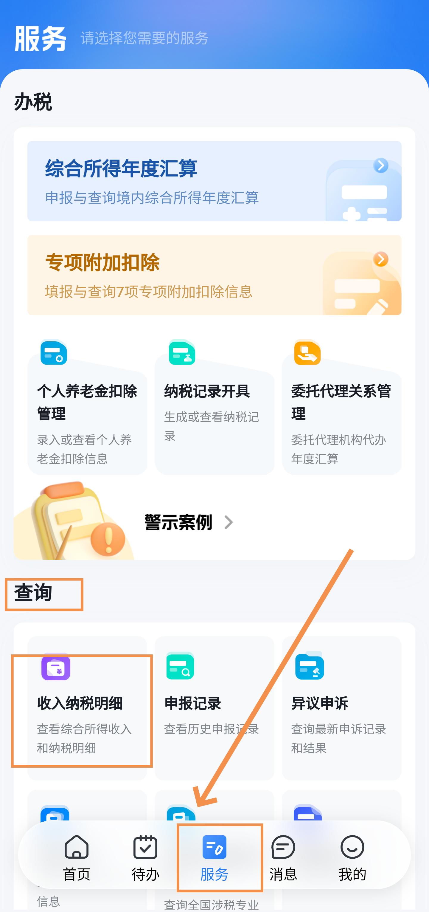 1、注册并登录个人所得税APP,在软件首页点击【收入纳税明细查询】。也可以通过服务页面点击【收入纳税明细查询】